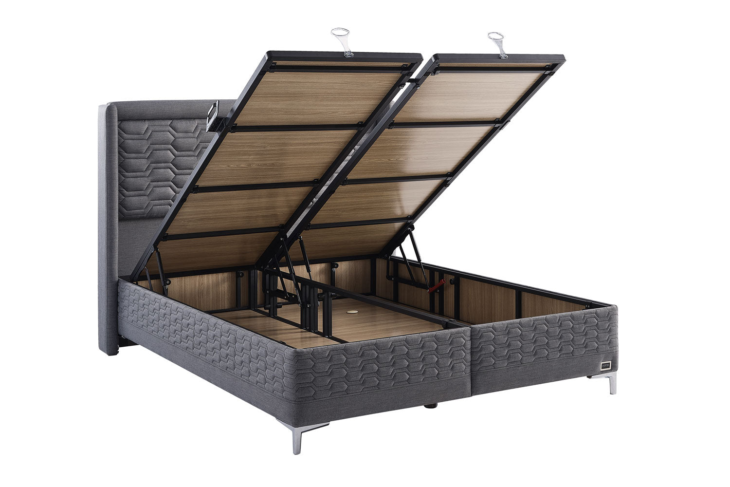 Der flexible und robuste Sockelgriff aus Silikon gewährleistet ein müheloses Öffnen und Schließen des Bettkastens. Die Lagerhaltervorrichtung verhindert das Verrutschen des Lagers, während das Balancer-System ein einfaches gemeinsames Öffnen der Türen ermöglicht.